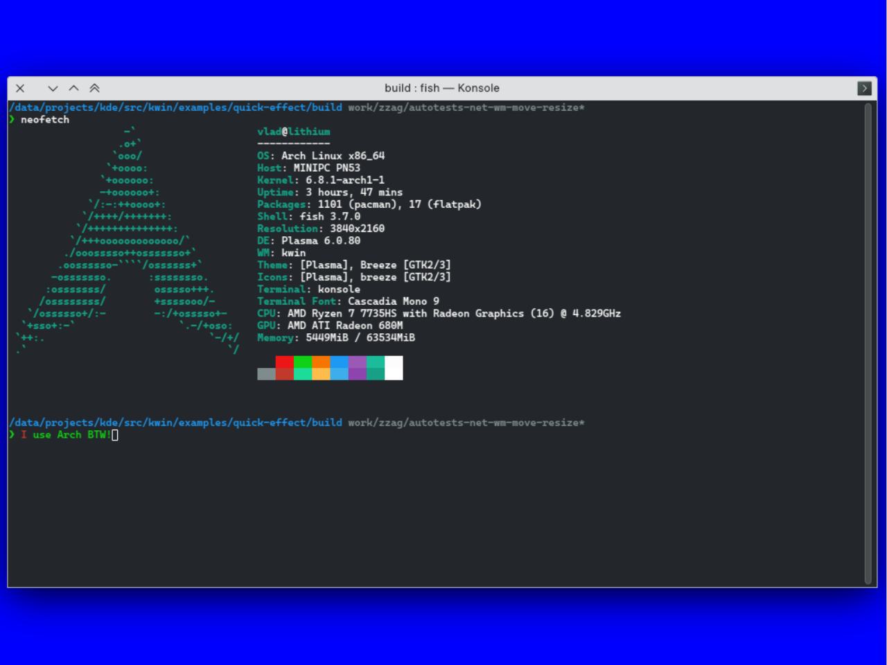 This is quite a lot to memorize. That’s why kwin provides an example qtquick effect that you can grab, tweak some metadata and you’re good to go. You can find the example project at https://invent.kde.org/plasma/kwin/-/tree/master/examples/quick-effect?ref_type=heads. Note that the example project also contains a CMakeLists.txt file, which provides an alternative way to install the effect by the means of cmake, i.e. make install or cmake --install builddir.