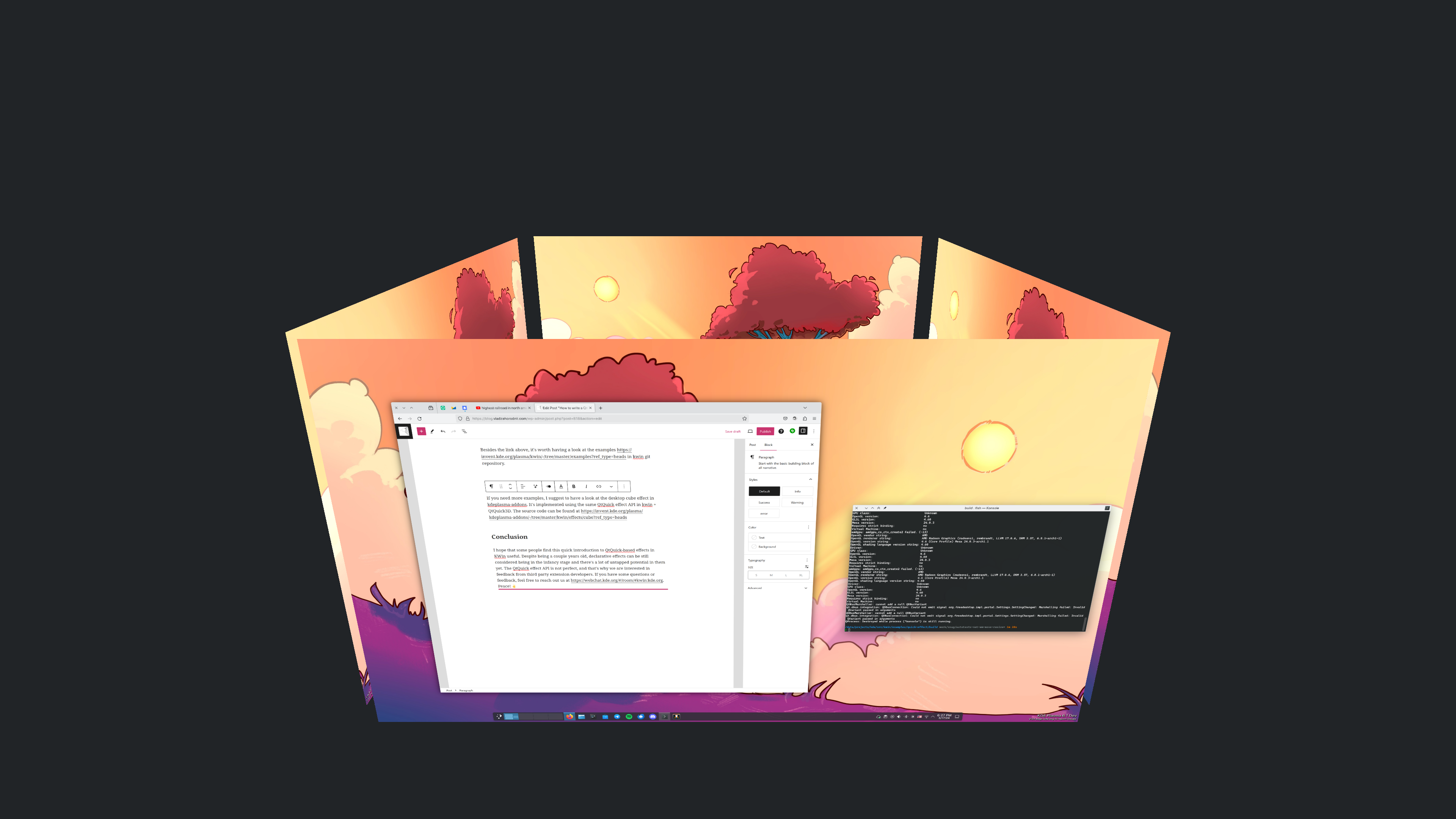 On X11, all window changes typically take place immediately, including resizing. This can lead to some issues. For example, if a window is resized, it can take a while until the application repaints the window with the new size. What if the compositing manager decides to compose the screen in meanwhile? You’re likely going to see some sort of visual glitches, e.g. the window contents getting cropped or seeing parts of the window that have not been repainted yet.