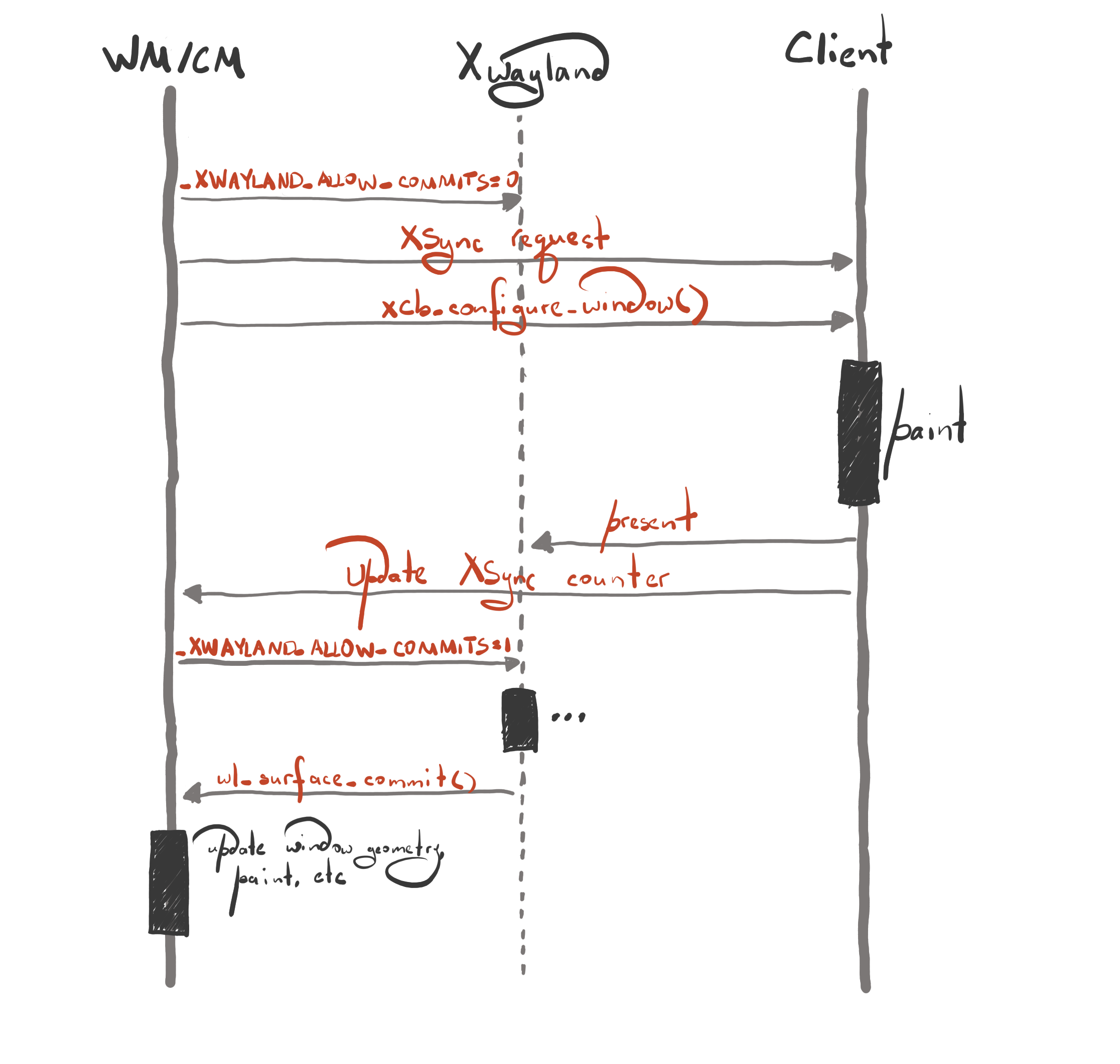 The compositor blocks wl_surface commits by setting the _XWAYLAND_ALLOW_COMMITS property to 0 for the toplevel X11 window. This is needed to ensure the consistent order between XSync request acknowledgements and wl_surface commits. As long as the _XWAYLAND_ALLOW_COMMITS property is set to 0, Xwayland will not attempt to commit the wayland surface, for example attach a new graphics buffer after the client repaints the window;