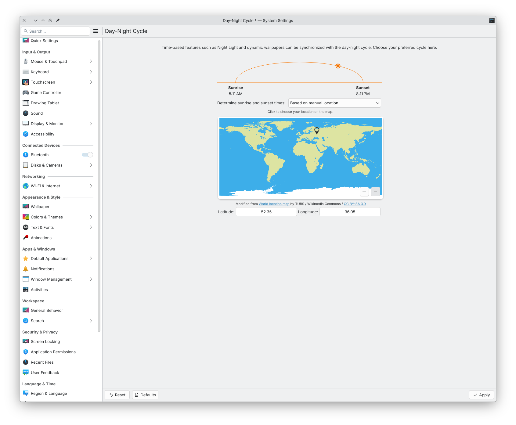 Since all features that synchronize to the day/night cycle subscribe to KNightTime, you only need to configure it to use specific morning and evening times. Night Light, day/night wallpapers and so on will be all synchronized.
